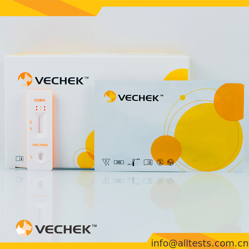 対称性ジメチルアルギニン(SDMA)ラピッドテストカセット(全血/血清/血漿)は、イヌおよびネコの全血、血清、血漿中のSDMAを14μg/dLのカットオフ値で半定量的に検出するための、ラテラルフロー免疫クロマトグラフィーアッセイです。獣医用のみ。