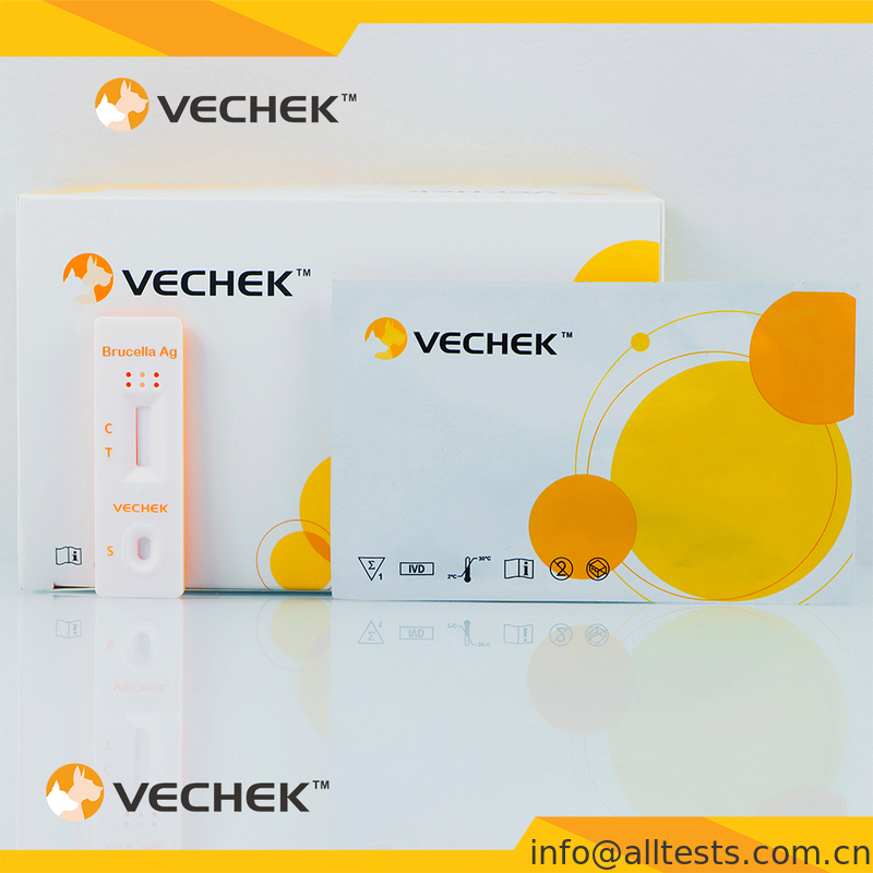 ブルセラ抗原迅速検査は、サンドイッチ法によるラテラルフローイムノクロマトグラフィーアッセイに基づいています。検査カセットには、アッセイの実行と結果の読み取りを観察するための検査窓があります。検査窓には、アッセイ実行前に目に見えないT(テスト)ゾーンとC(コントロール)ゾーンがあります。処理されたサンプルを検査カセットのサンプルウェルに適用すると、液体はテストストリップの表面を横方向に流れ、あらかじめコーティングされたブルセラ抗体と反応します。検体に抗ブルセラ抗原が含まれている場合、目に見えるTラインが現れます。Cラインは、サンプルが適用された後常に現れるはずであり、有効な結果を示します。これにより、検査カセットは、検体中のブルセラ抗原の存在を正確に示唆することができます。